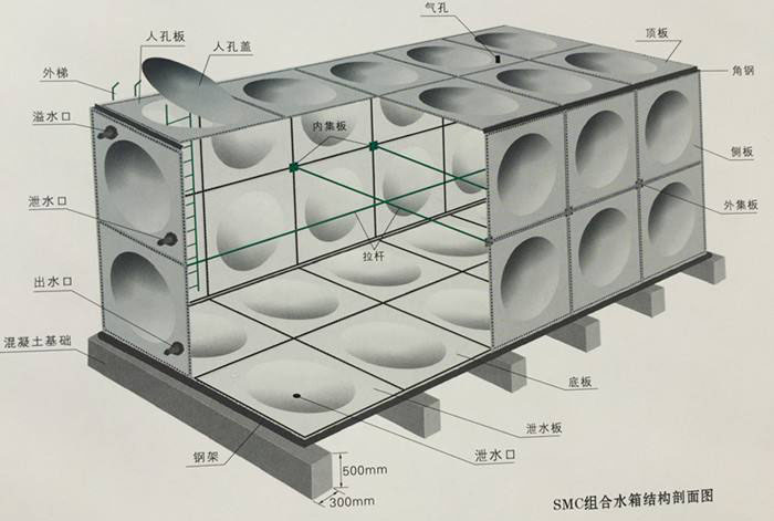 玻璃鋼水箱是由SMC模壓板塊、密封材料、金屬結構件及配管系統(tǒng)現(xiàn)場組裝而成。一般水箱按標準設計,個別水箱需要個別設計?筛鶕(jù)用戶需要組裝0.125 —1500立方米的水箱。若原有水箱需要換,不需要改造房屋,適應性很強。潛心研制的定型產(chǎn)品密封帶,該密封帶耐水、彈性大、變型小,緊固密封。